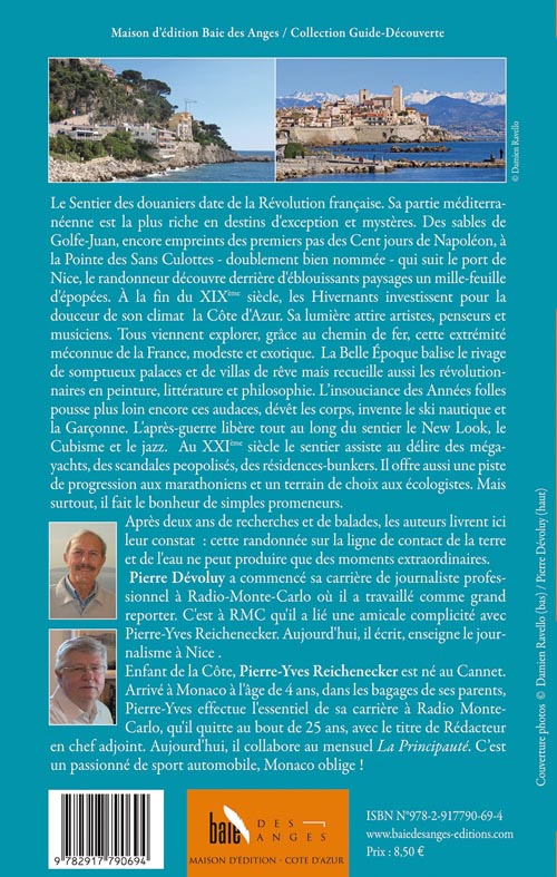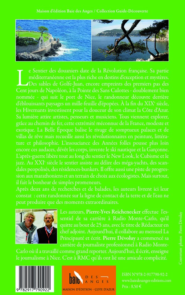 Le Sentier des douaniers date de la Révolution française. Sa partie méditerranéenne est la plus riche en destins d'exception et mystères. Des sables de Golfe-Juan, encore empreints des premiers pas des Cent jours de Napoléon, à la Pointe des Sans Culottes - doublement bien nommée - qui suit le port de Nice, le randonneur découvre derrière d'éblouissants paysages un mille-feuille d'épopées.