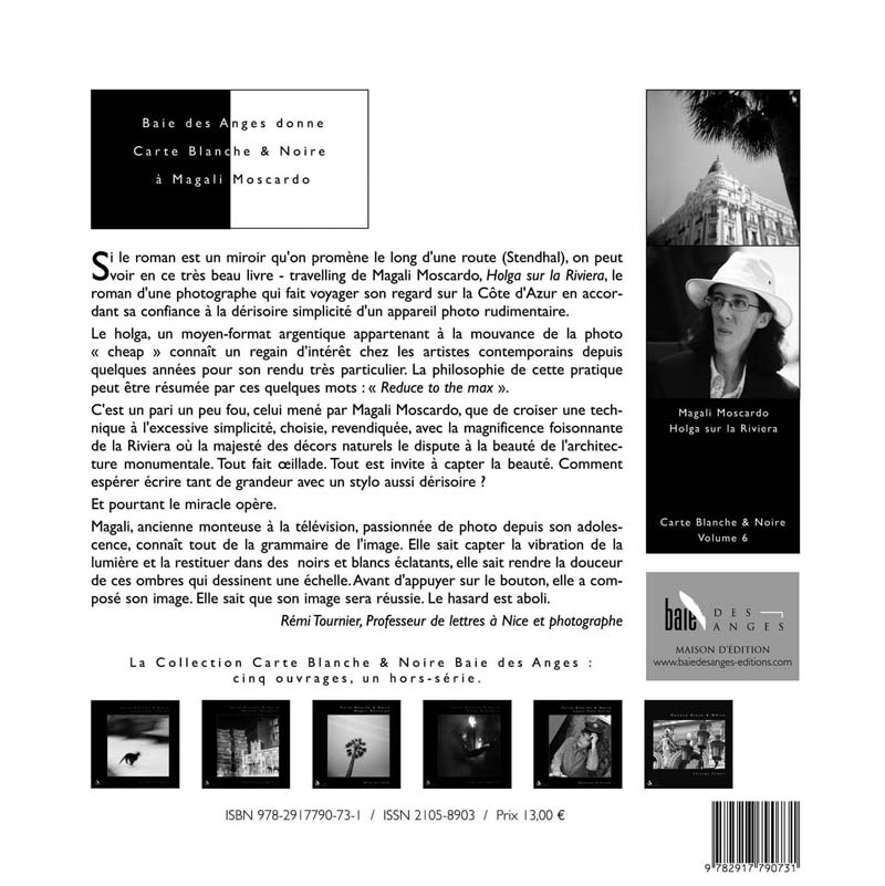 Si le roman est un miroir qu'on promène le long d'une route (Stendhal), on peut voir en ce très beau livre - travelling de Magali Moscardo, Holga sur la Riviera, le roman d'une photographe qui fait voyager son regard sur la Côte d'Azur en accordant sa confiance à la dérisoire simplicité d'un appareil photo rudimentaire.