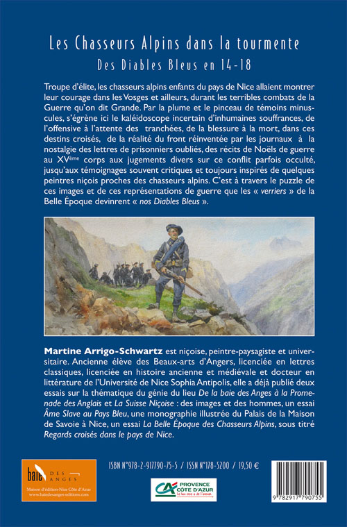 Troupe d’élite, les chasseurs alpins enfants du pays de Nice allaient montrer leur courage dans les Vosges et ailleurs, durant les terribles combats de la Guerre qu’on dit Grande. Par la plume et le pinceau de témoins minuscules, s’égrène ici le kaléidoscope incertain d’inhumaines souffrances, de l’offensive à l’attente des tranchées, de la blessure à la mort, dans ces destins croisés, de la réalité du front réinventée par les journaux à la nostalgie des lettres de prisonniers oubliés, des récits de Noëls de guerre au XVème corps aux jugements divers sur ce conflit parfois occulté, jusqu’aux témoignages souvent critiques et toujours inspirés de quelques peintres niçois proches des chasseurs alpins. C’est à travers le puzzle de ces images et de ces représentations de guerre que les « verriers » de la Belle Époque devinrent « nos Diables Bleus ».